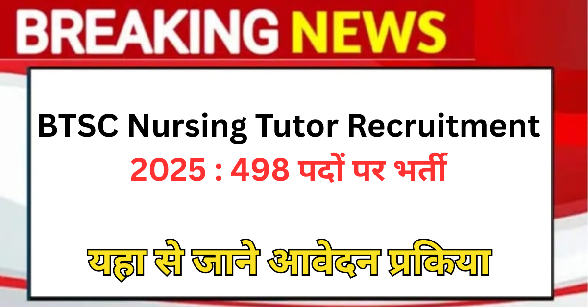 BTSC Nursing Tutor Recruitment 2025 : अगर आप नर्सिंग के क्षेत्र में अनुभव रखते हैं और एक स्थायी सरकारी नौकरी की तलाश कर रहे हैं, तो आपके लिए यह एक बेहतरीन अवसर है। बिहार तकनीकी सेवा आयोग (BTSC) ने नर्सिंग ट्यूटर के 498 पदों पर भर्ती का नोटिफिकेशन जारी किया है। आवेदन की प्रक्रिया ऑनलाइन शुरू हो चुकी है और उम्मीदवार 01 अगस्त 2025 तक btsc.bihar.gov.in पर जाकर आवेदन कर सकते हैं।
