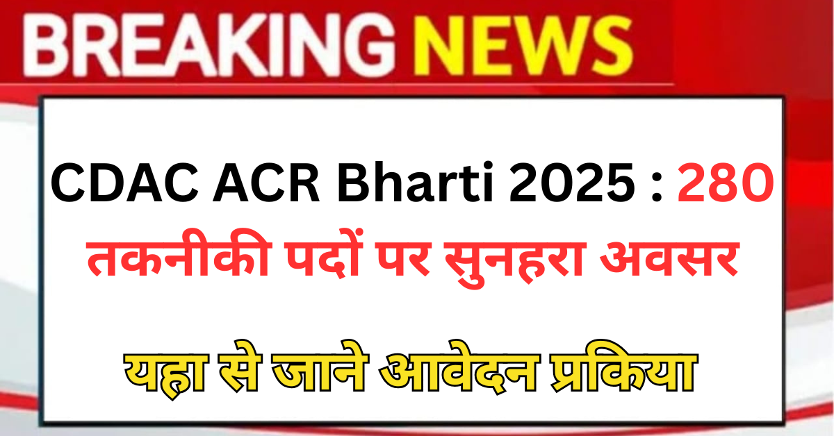 CDAC ACR Bharti 2025 : अगर आप तकनीकी क्षेत्र में करियर बनाने की सोच रहे हैं और चाहते हैं कि आपका अगला कदम एक सम्मानित सरकारी संस्थान की ओर हो, तो CDAC ACR भर्ती 2025 आपके लिए एक शानदार मौका हो सकता है। Centre for Development of Advanced Computing (CDAC) ने अपने Advanced Computing Research प्रोजेक्ट के तहत कुल 280 पदों पर भर्ती की अधिसूचना जारी की है, जिसमें Design Engineer से लेकर Chief Technical Manager तक के पद शामिल हैं।